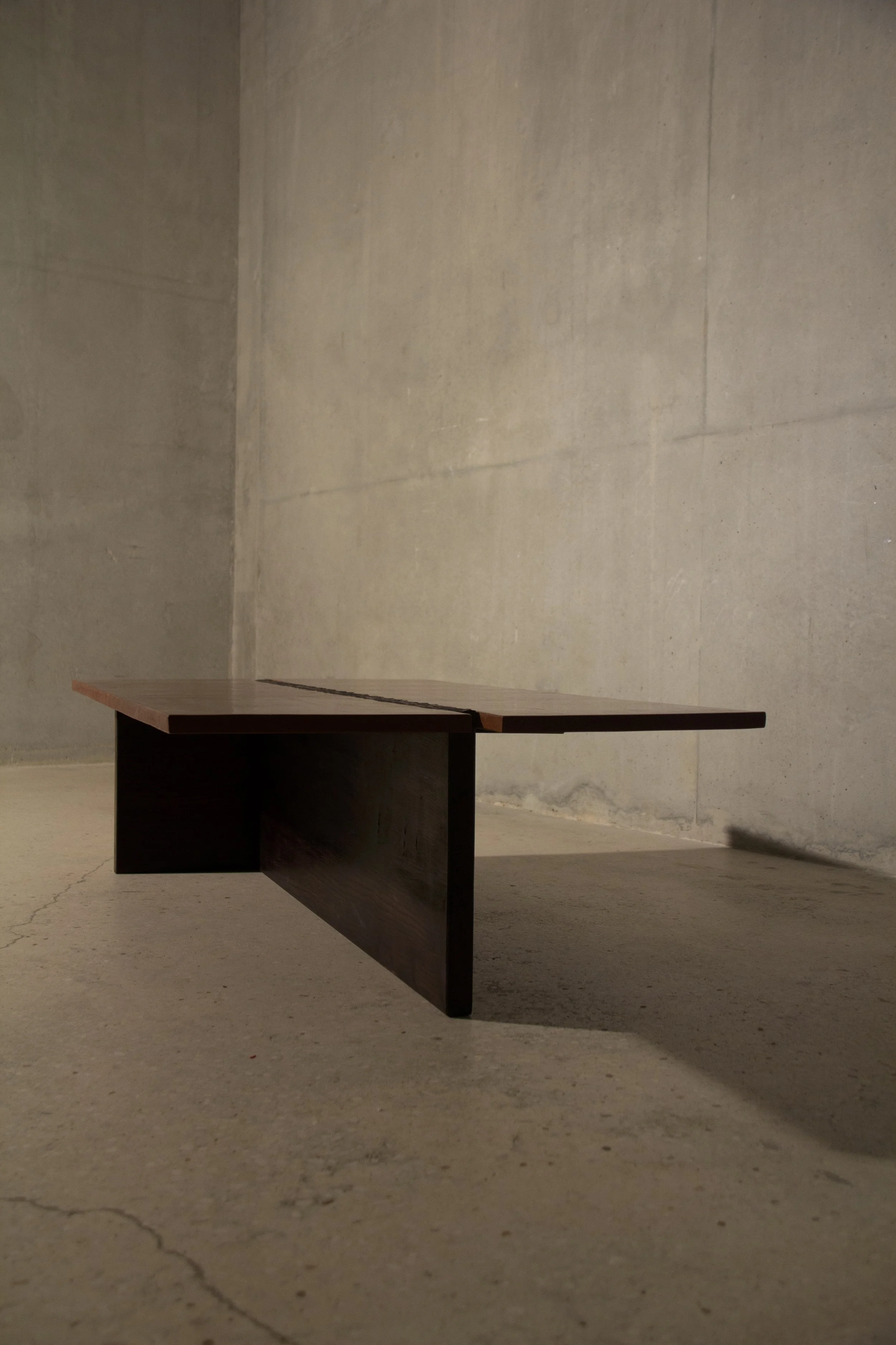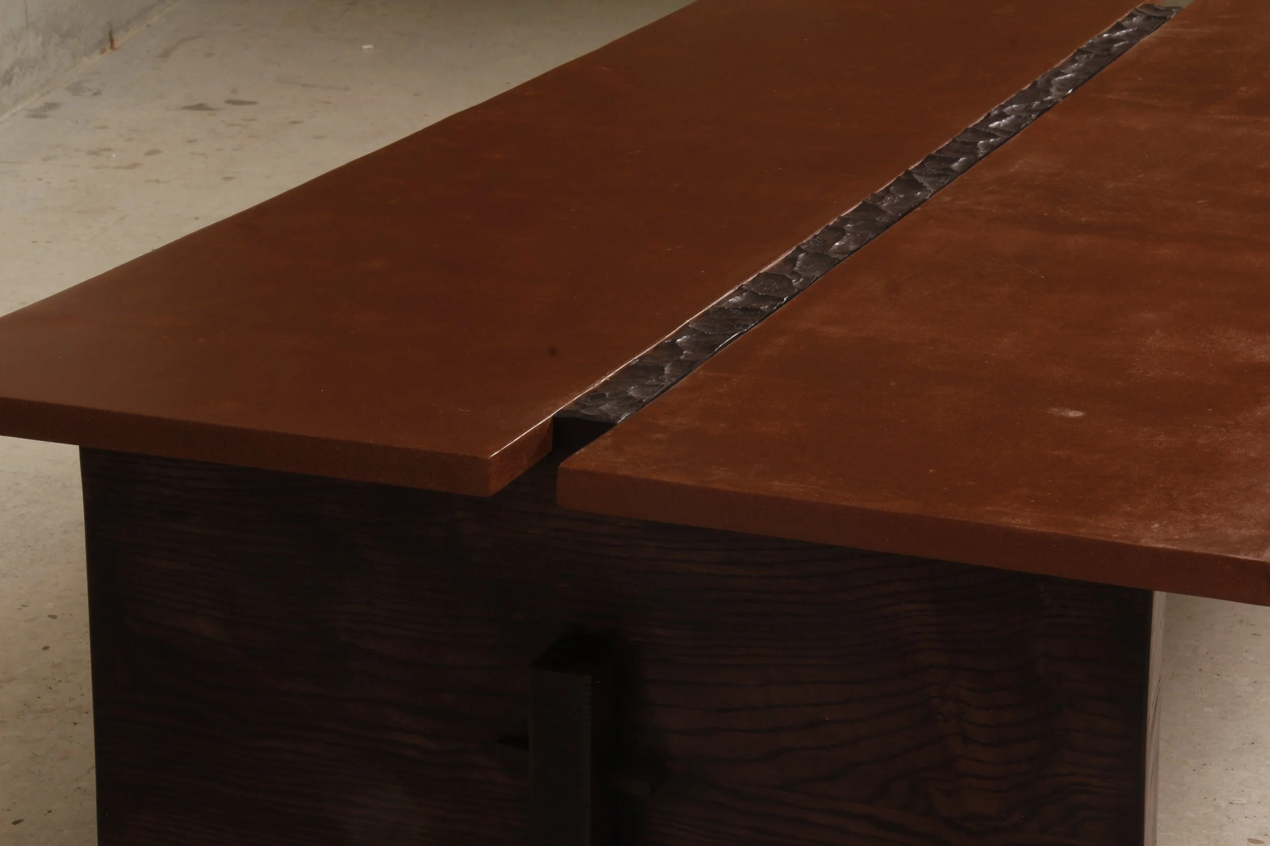 Table composée de deux plaques de bauxite polie, séparées par une faille de bois sculptée.