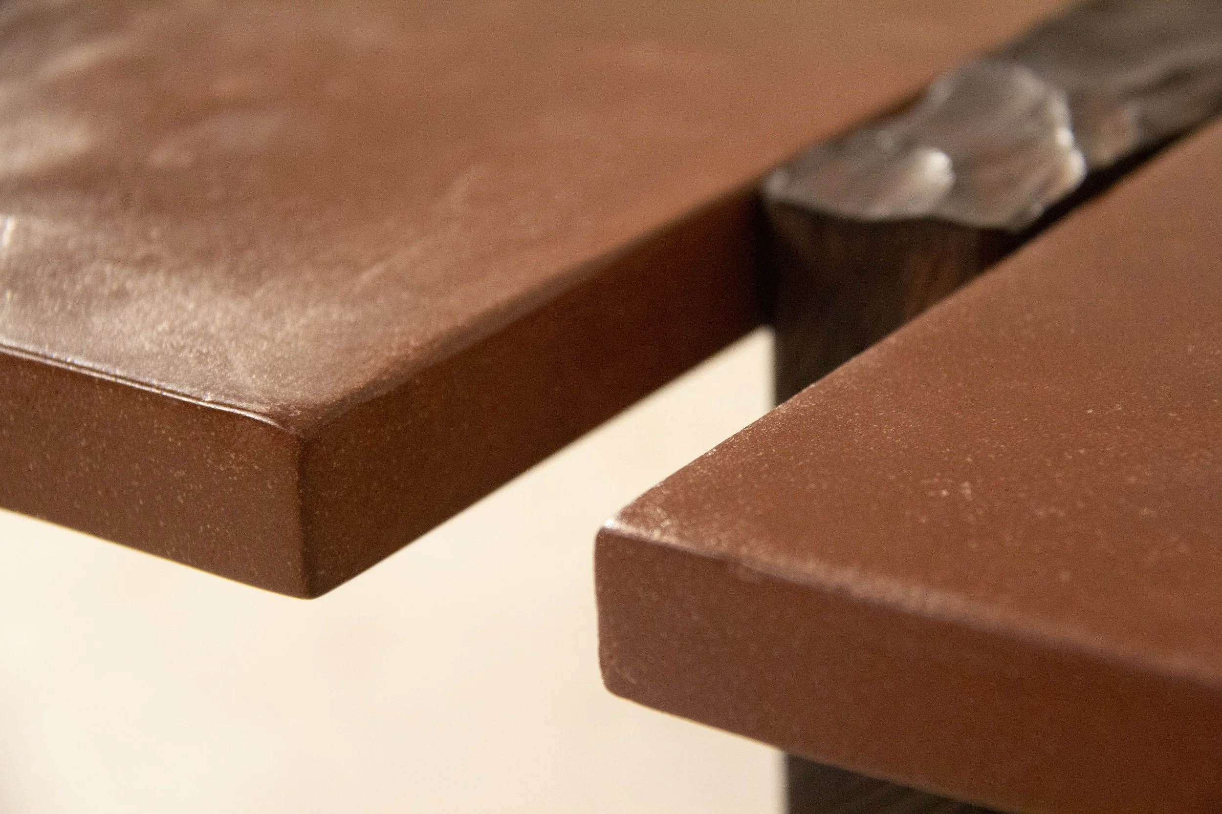 Le veinage du frêne traverse la surface minérale, comme un filon dans la roche.